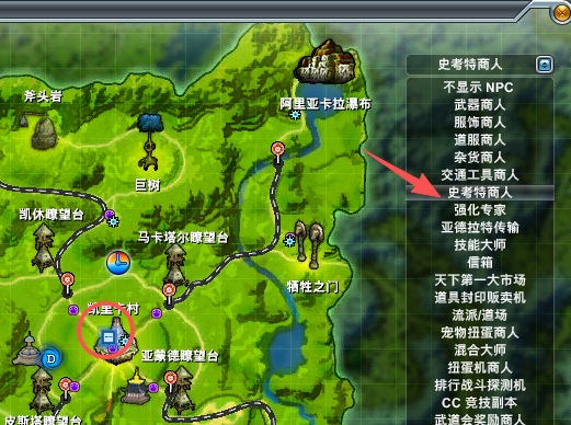 新手前期可以去凯里卡村找到史考特商人购买有探测龙珠功能的史考特 按M打开地图有时间选择史考特商人就会显示他的位置