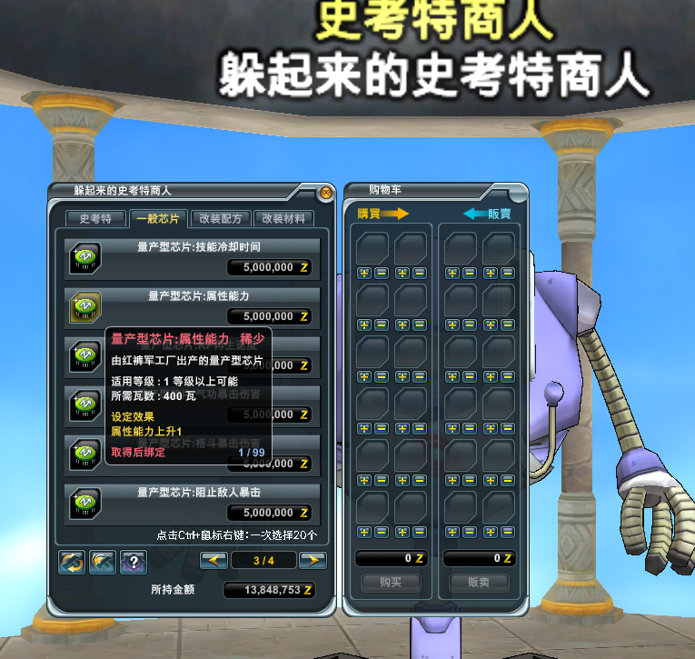 天神殿上面有个躲起来的史考特商人 建议先购买5个属性能力芯片进行插入 1属性能力等于1%攻1%防