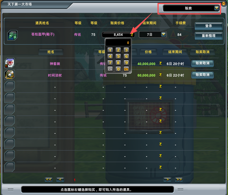 如果想要贩卖物品可以点击左上角购买的下拉框 选择贩卖 然后打开背包右键想要贩卖的物品或者鼠标把物品拖入其中也可以