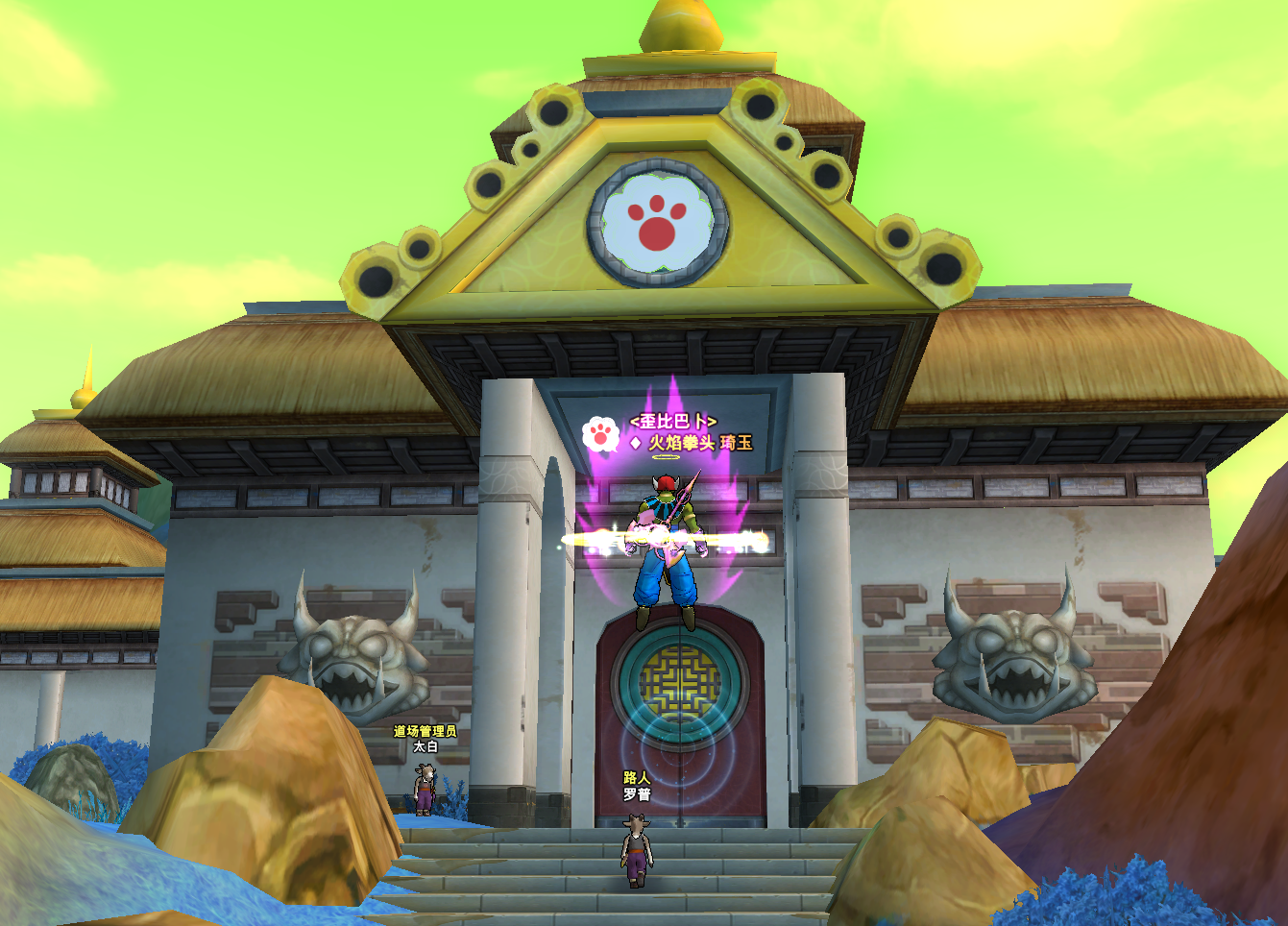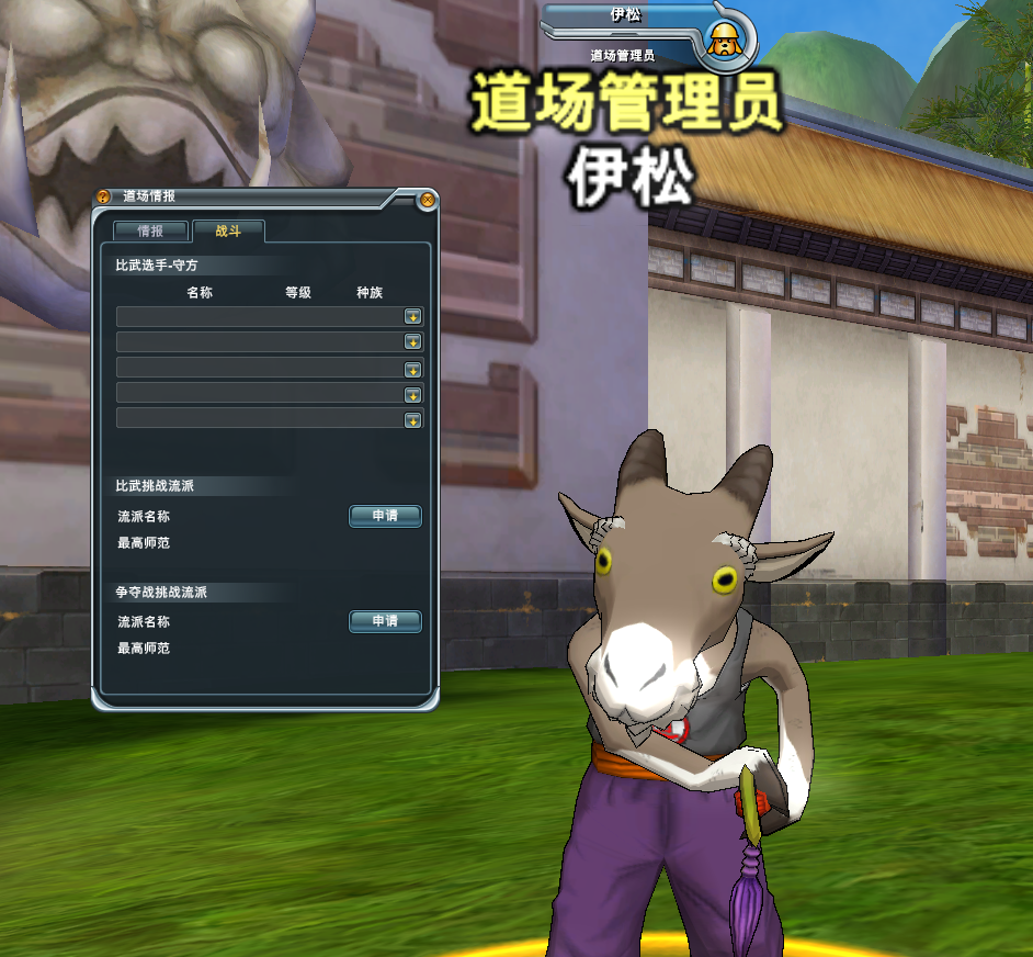 然后就可以在想要争夺的道场门口道场管理员NPC除发起挑战